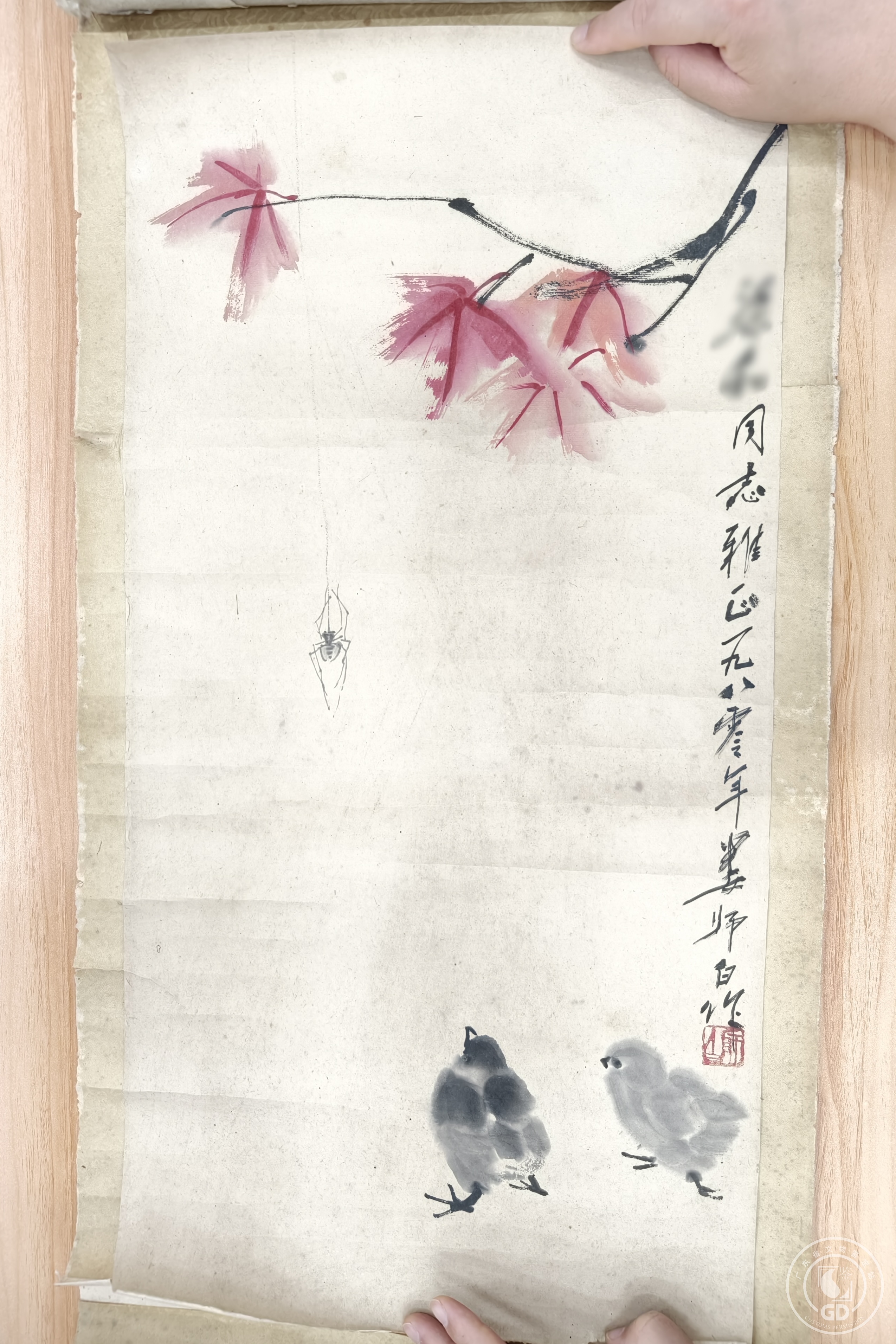 值得一提的是,在遂溪站活动中,鉴定站书画鉴定专家看到了一幅1980年由著名画家娄师白创作的《双雏争蛛》画轴。娄师白是国画大师齐白石的入室弟子,从14岁开始就跟随齐白石学习书法、绘画和刻印,擅于通过细腻的笔触和墨色的巧妙运用,呈现自然和生活的和谐美感。在国家文物局颁布的《1911年后已故书画等8类作品限制出境名家名单》中,娄师白被列入“代表作不准出境者”书画名家名单。